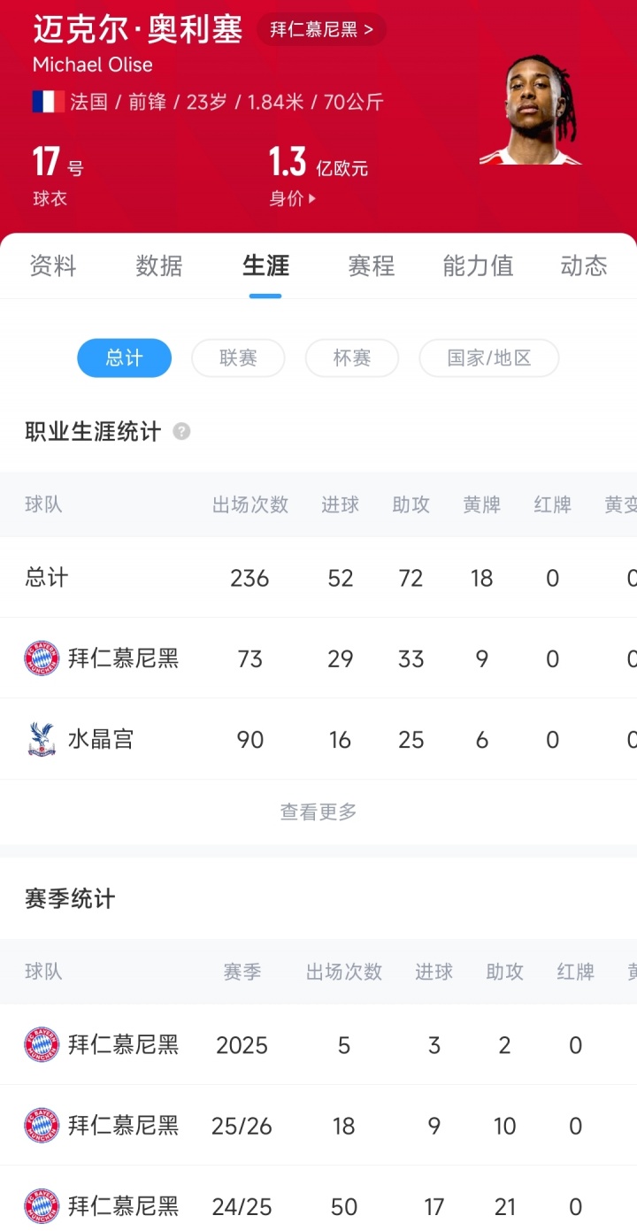 2024年夏窗,奥利塞以5300万欧元的转会费从水晶宫加盟拜仁,于今出战73场比赛29球33助,现在奥利塞的德回身价还是达到了1.3亿欧元,他与拜仁的协议将在2029年到期。