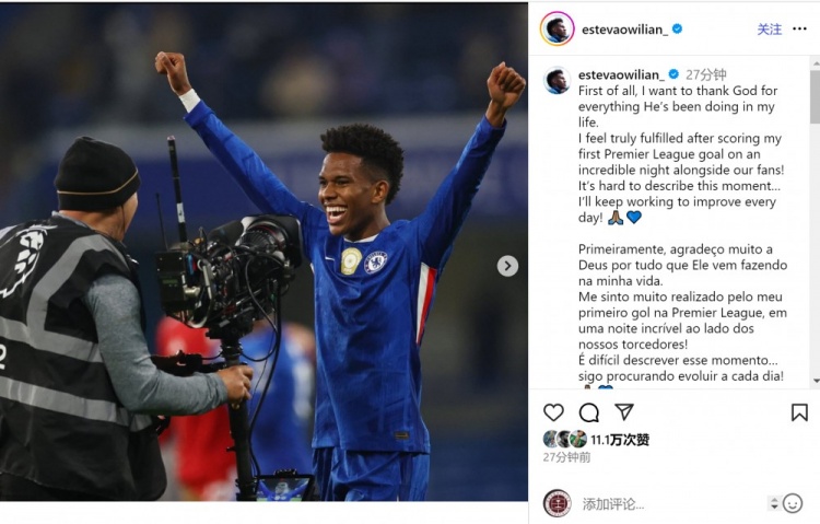 埃斯特旺社媒晒出庆祝的像片,配文:“当先,我要感谢天主在我性掷中所作念的一切。在与球迷共度的特出之夜攻入个东说念主英超首球之后,我感到无比称心!