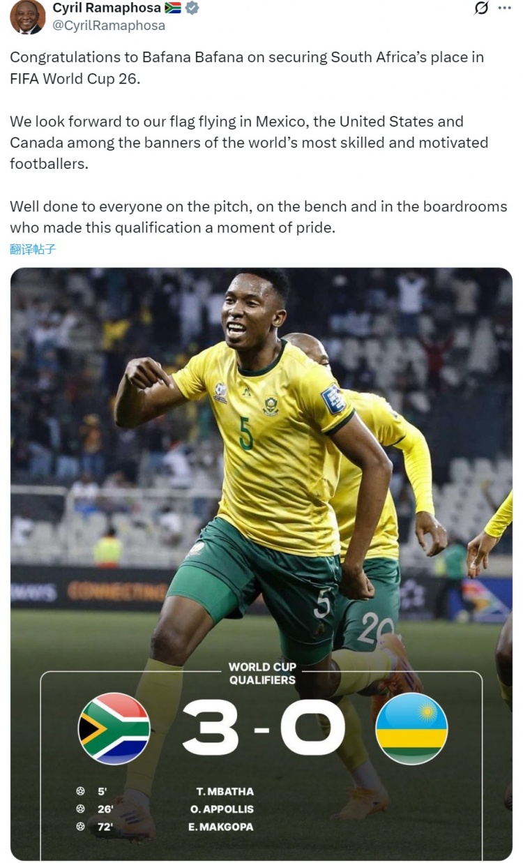 南非总统拉马福萨连发两条推文,对南非队暗示道喜,首条推文写说念:“咱们进击2026年寰宇杯!祝贺南非国度队整体成员,通盘南非将一如既往地复旧你们,一说念同业。”