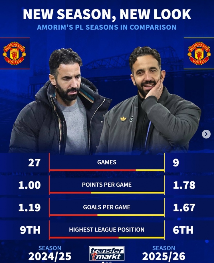10月30日讯 阿莫林握教的曼联在本赛季英超施展回暖,《转会市集》数据统计暴露也彰着好于上赛季。