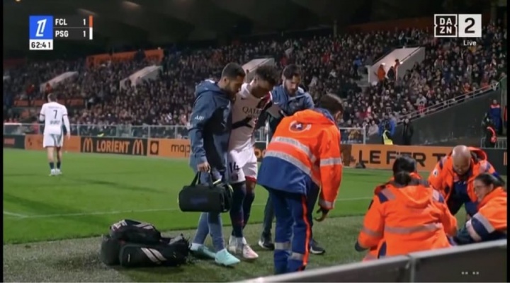 10月31日讯 rmcsport报说念,在周三的法甲联赛中,巴黎圣日耳曼与洛里昂战成1-1平局。比赛进行到第61分钟时,20岁的法国国脚德西雷-杜埃因右大腿受伤被担架抬出场外。尽管他在比赛中进展欠安,但此次伤病彰着对他形成了很大的困扰。
