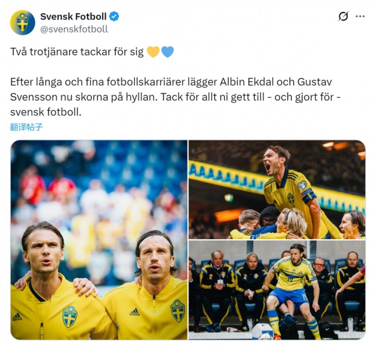 11月11日讯 前瑞典国脚埃克达尔、古斯塔夫·娴雅松退役,瑞典足协社媒发文感谢他们的孝顺。