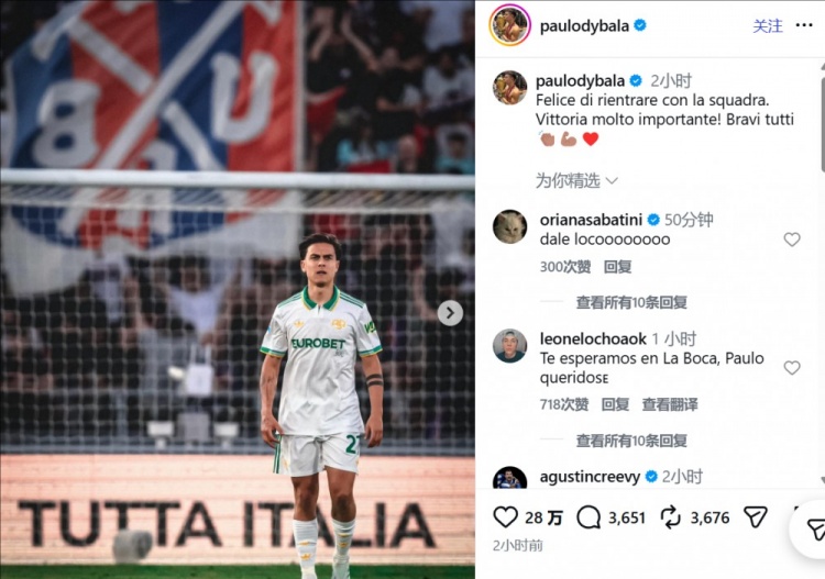迪巴拉复出社媒:很高兴能回归球队,非常重要的获胜