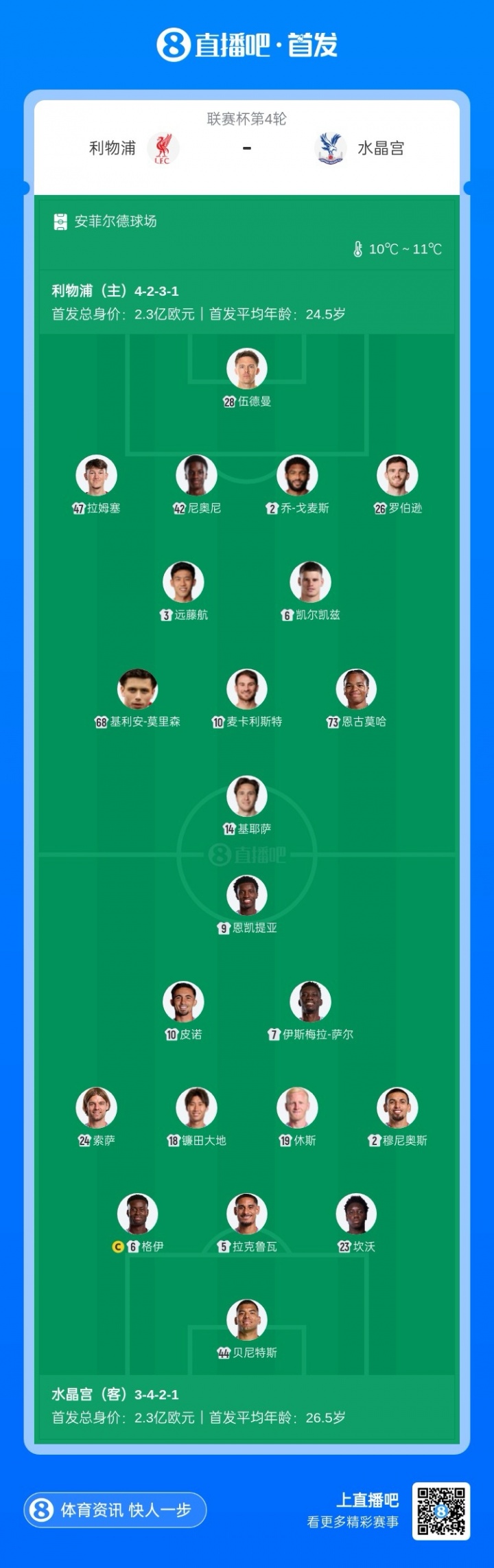 联赛杯大瓜代!利物浦vs水晶宫首发:基耶萨、恩古莫哈、麦卡出战