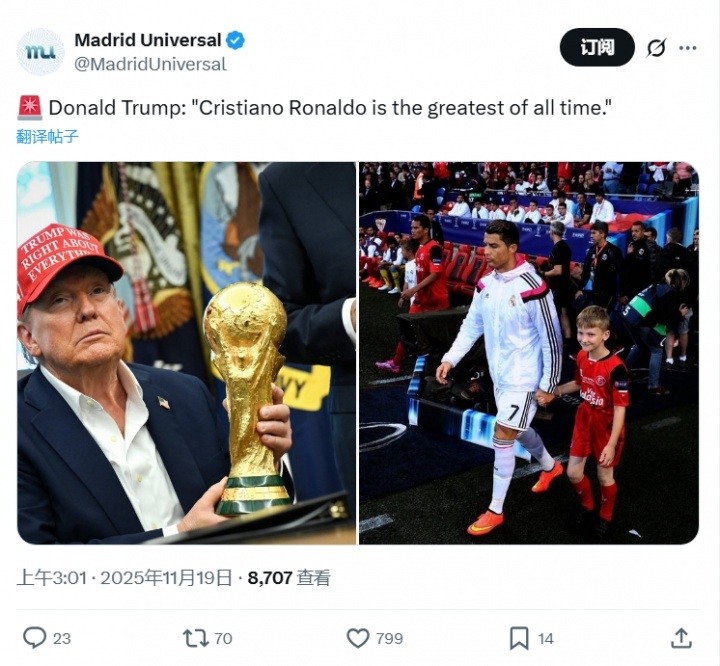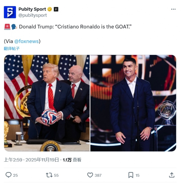 11月19日讯 此前报说念称,沙特王储穆罕默德·本·萨勒曼在白宫与特朗普会面,C罗受到特朗普理财。沙特王储与特朗普会面运行后,有多个博主、自媒体称特朗普暗示:“C罗是历史最好球员。”