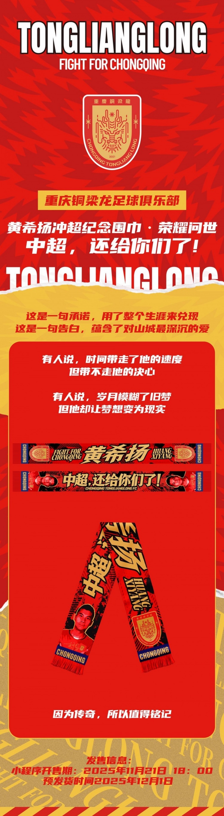 本日重庆铜梁龙俱乐部官方文告,将发售黄希扬冲超顾忌领巾。这款领巾上头印有黄希扬的头像,同期还有他的标语“中超,还给你们了!”,今晚(11月21日)18:00,这款领巾就将在重庆铜梁龙俱乐部官方小步调认真开售。