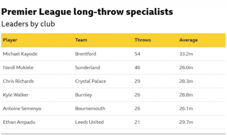 Opta盘货了本赛季英超球员手抛球数目情况,布伦特福德的卡约德以54次居首,平均距离达到了33.2米。位居自后的是桑德兰的穆基勒(46次,平均距离28米),水晶宫的克里斯-理查兹(29次,平均距离28.3米),伯恩利的凯尔-沃克(26次,平均距离28.8米),伯恩茅斯的塞梅尼奥(26次,平均距离26.1米),利兹联的阿姆帕杜(21次,平均距离29.7米)。