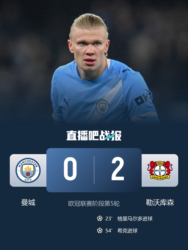 欧冠首败!曼城轮流0-2勒沃库森 哈兰德失良机+劝诱4轮破门闭幕