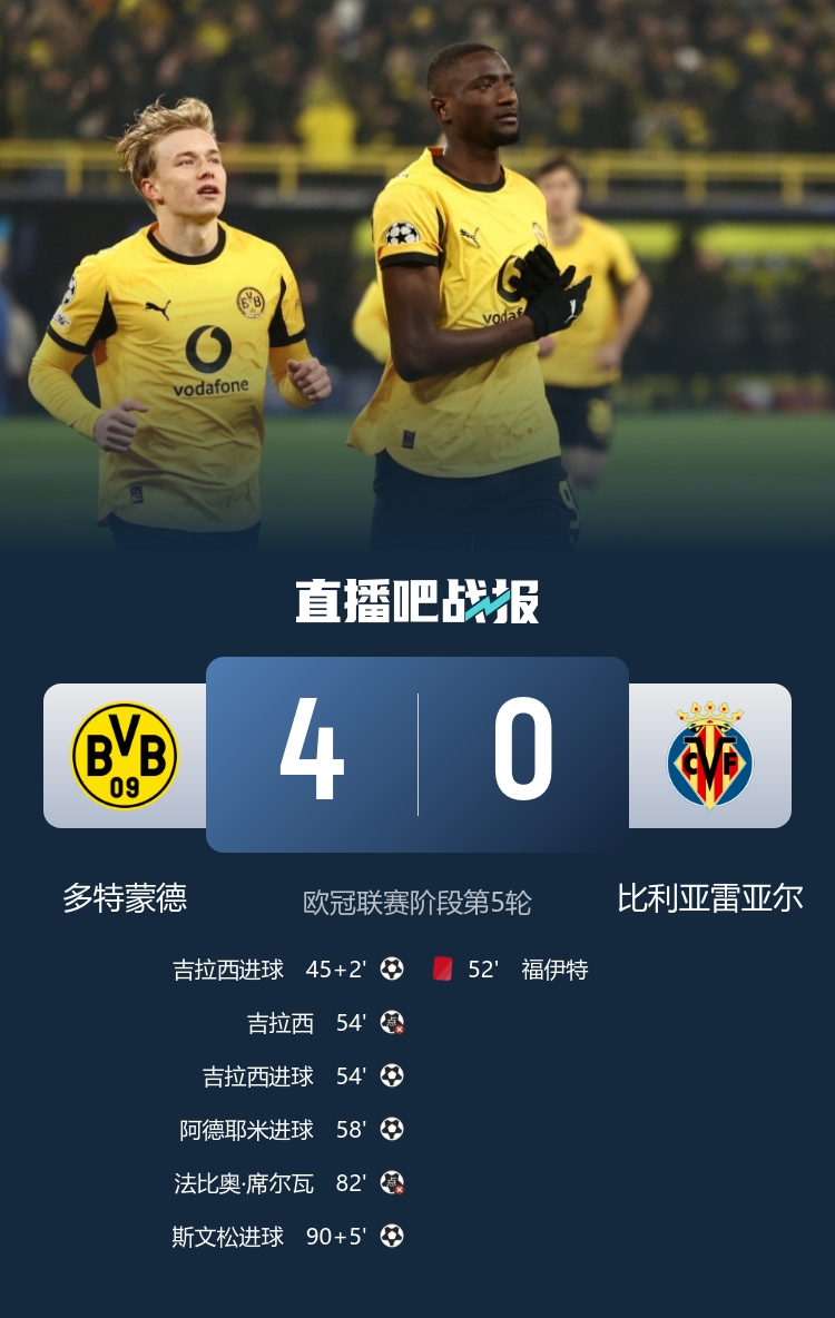 吉拉西双响,阿德耶米、闲雅松破门,多特4-0十东谈主比利亚雷亚尔近四场比赛首胜。