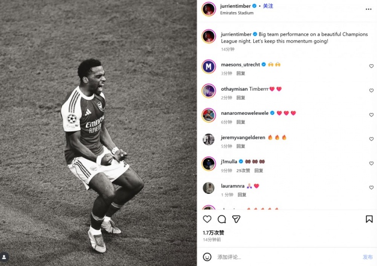 头球破僵!廷伯社媒庆祝:机密的欧冠之夜,让咱们不绝面前势头!