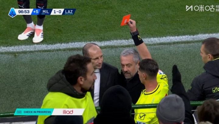 米兰vs拉王人奥补时第95分钟,裁判介入看VAR,查验帕夫洛维奇手球!阿莱格里怒了!被出示红牌!
