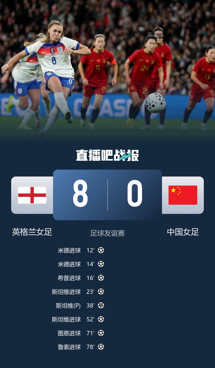 足球友谊赛,英格兰女足8-0大捷中国女足,女足全场遭压制,控球仅3成+6射门2射正。