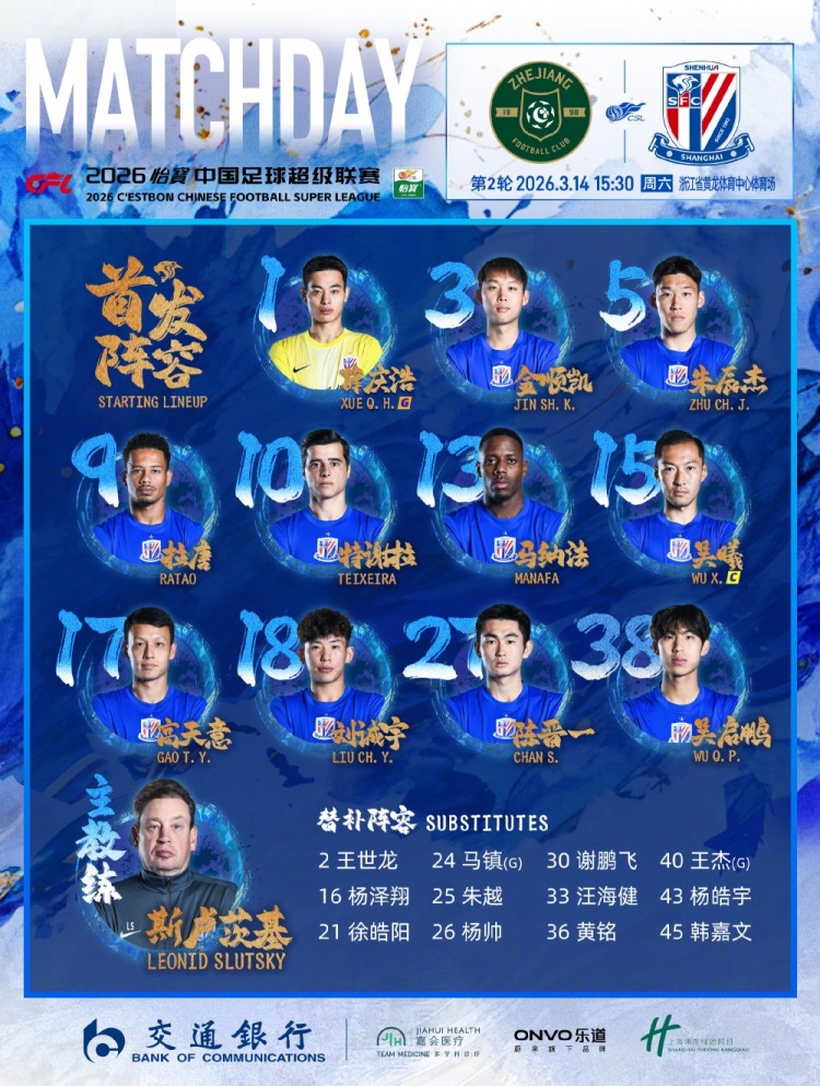 2026中超对抗赛第2轮 浙江足球球队组织绿城vs上海申花 首发阵容名单