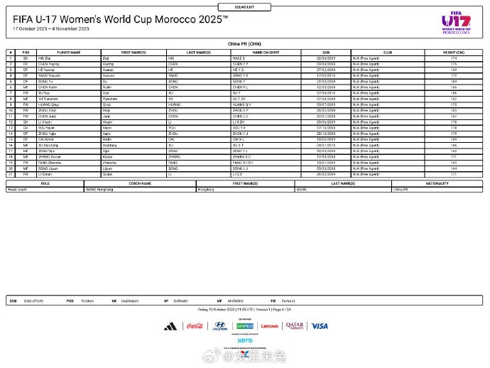 10月11日讯 中国U17女足的U17女足宇宙杯报名名单公布,共21名球员入选。