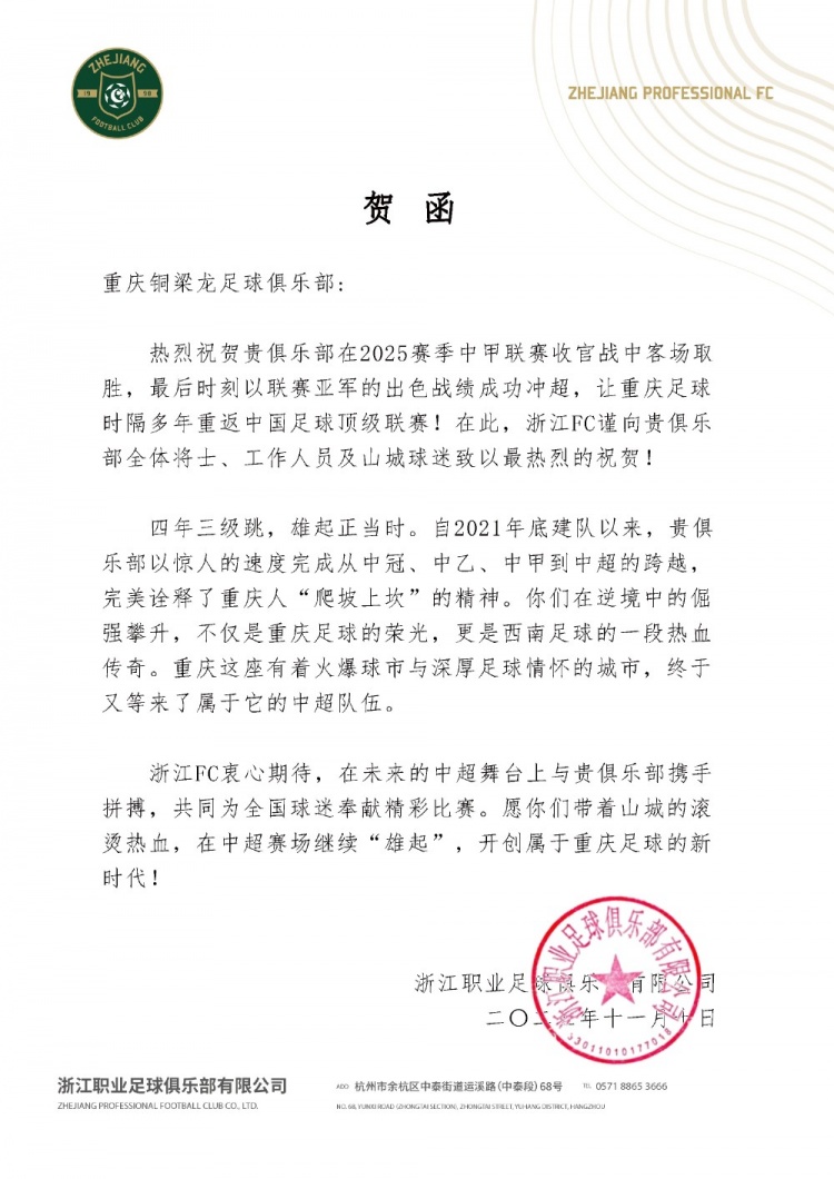 横暴道贺贵俱乐部以2025赛季中国足球甲级联赛冠军的身份,得胜登上中超联赛舞台!在此,浙江FC谨向贵俱乐部整体评释员、通顺员及职责主说念主员,以及总共辽沈球迷致以最诚挚的道贺与敬意!