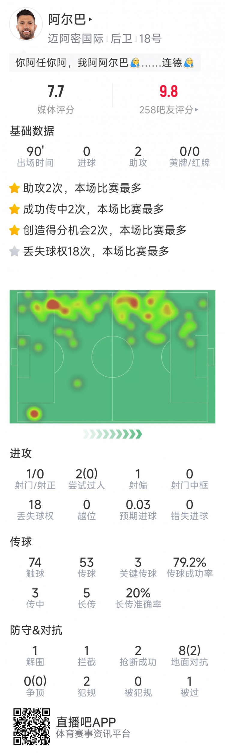 阿尔巴本场数据:助攻双响,3次关键传球,2次抢断,评分7.7分
