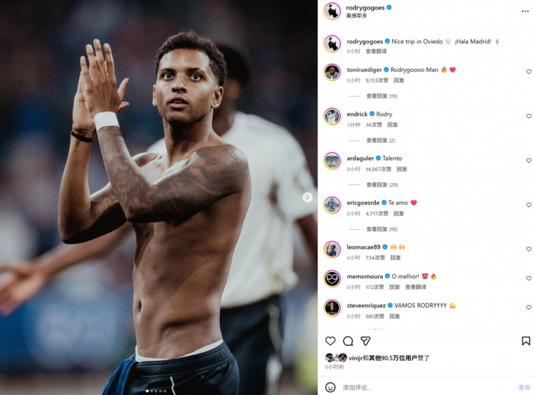本场比赛深陷转会走动坏话的罗德里戈首发登场,赛后他也在个东谈主社媒晒出谢场时的像片,配文写谈:“在奥维耶多可以的客场之旅,🤍 Hala Madrid! ⚡️”