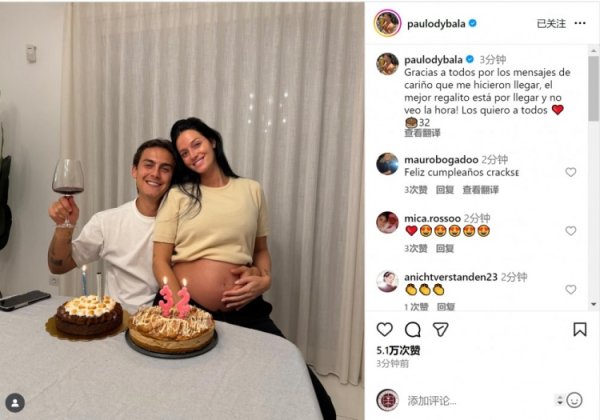 迪巴拉社媒晒与怀胎老婆合照:感谢生辰道贺,最棒的礼物行将到来