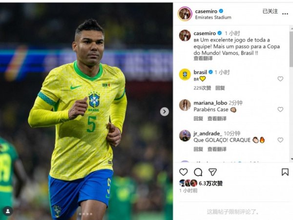 卡塞米罗社媒庆祝顺利:全队进展出色,向寰球杯又迈进一步!