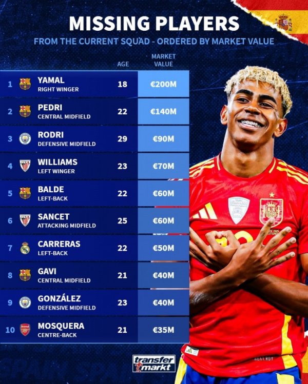 无缘本期西班牙队身价榜:亚马尔2亿欧居首,佩德里1.4亿欧次席