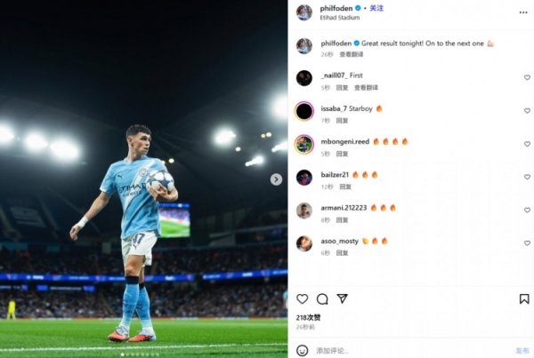 9月19日讯 曼城在本轮欧冠焦点战2-0力克那不勒斯,福登送出助攻。 第56分钟,曼城弧顶位置集合的短传合营,罗德里作念球,福登跟进回身送出精妙挑传,哈兰德头球吊射上钩。 他也在赛后通过社媒晒出我方的比赛照,并配文:“今晚的成果很棒!接续专注下一场。”......查看更多