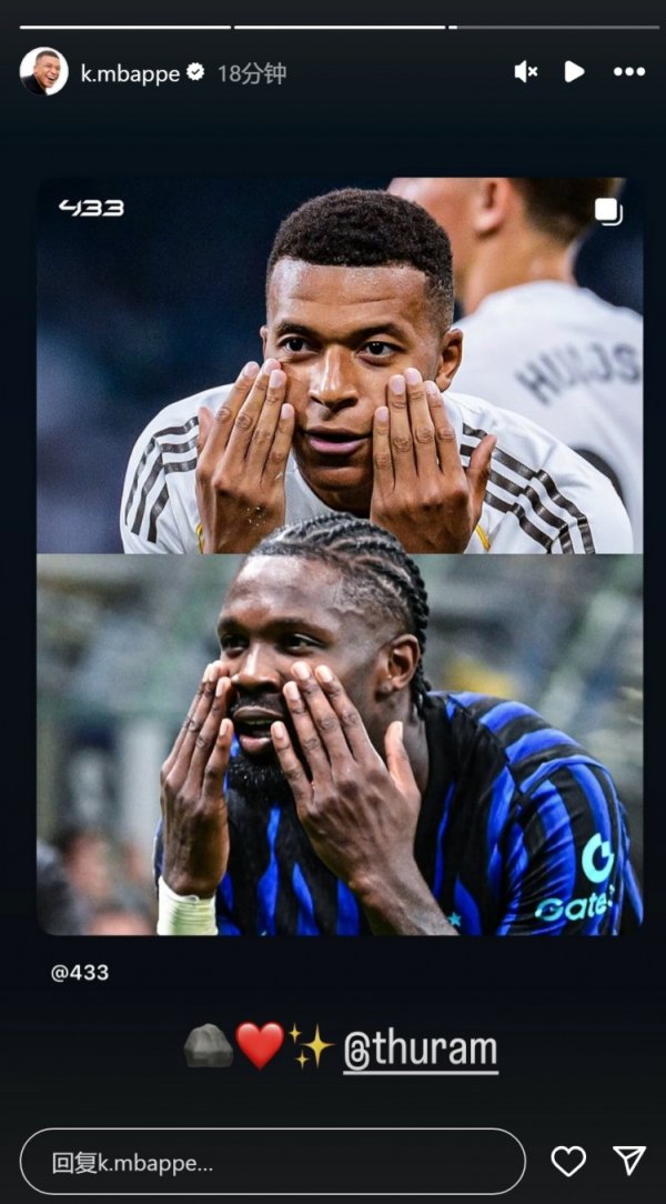 好手足!姆巴佩转发我方与图拉姆庆祝看成对比照,并@图拉姆