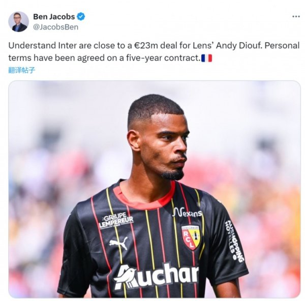 记者:国米已与朗斯中场迪乌夫谈妥5年合同
