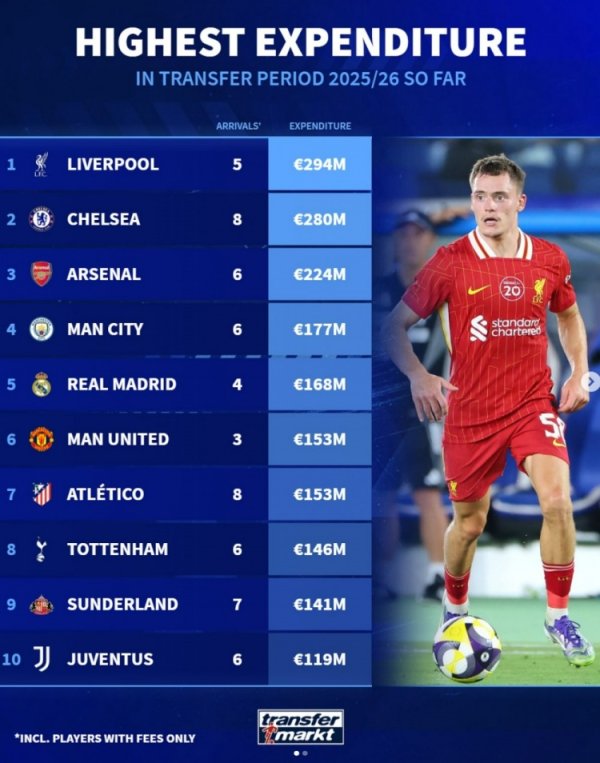 当今夏窗引援消耗榜:利物浦签5东说念主2.94亿欧居首,前四均来自英超