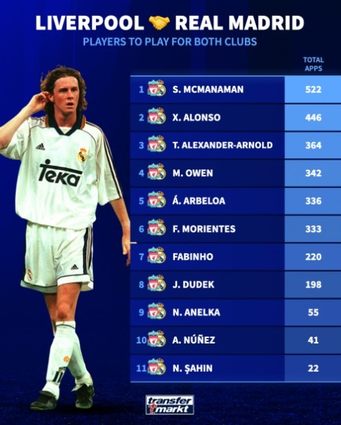 曾遵循利物浦、皇马球员为两队总出场次数排名:阿隆索446场第二