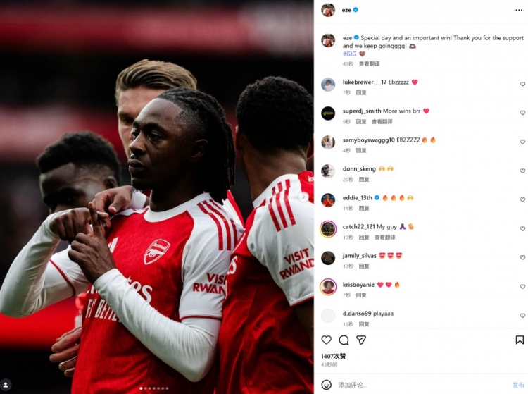 本场比赛埃泽濒临旧主打进制胜球,赛后他在个东说念主社媒晒出庆祝照,配文写说念:“特等的一天拿到一场伏击的获胜,感谢全球的维持,咱们不时前进!”