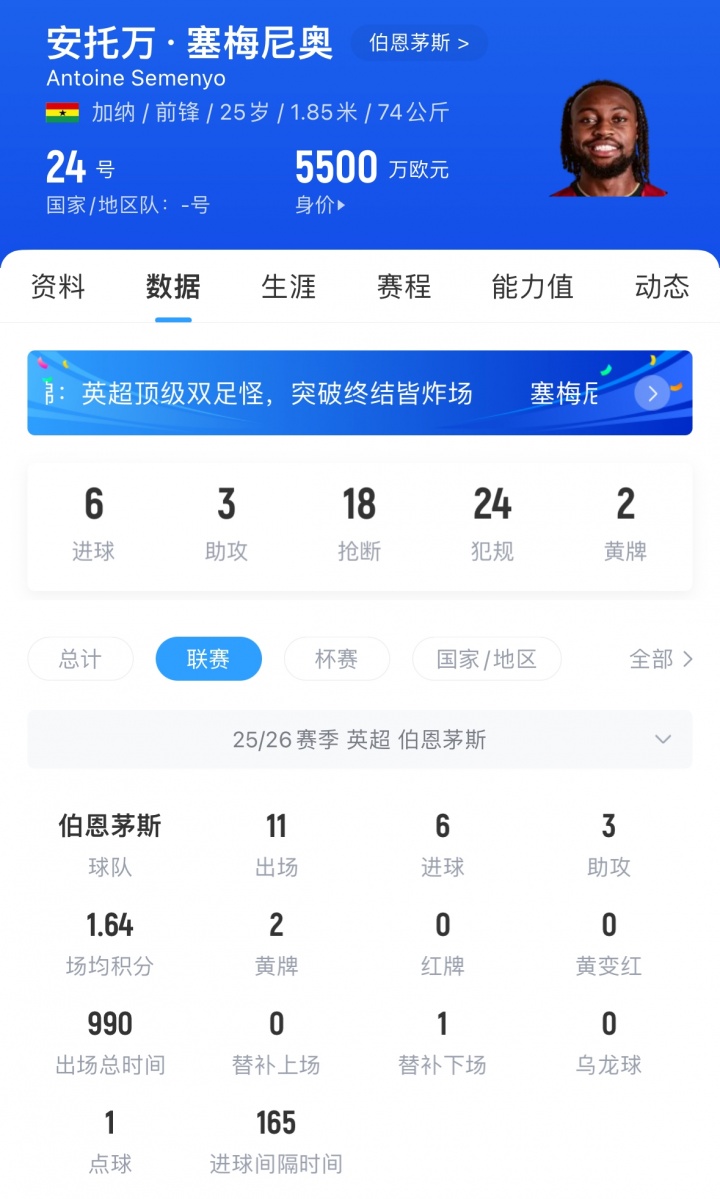 塞梅尼奥现年25岁,司职时尚,他本赛季为伯恩茅斯出战11场英超,孝敬6球3助,他与伯恩茅斯的协议将在2030年到期,现身价5500万欧。