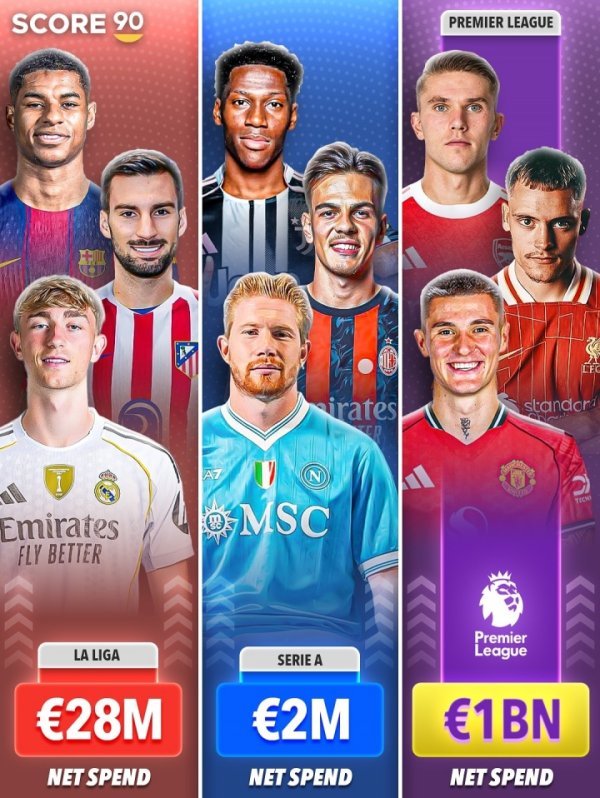 4大联赛夏窗净干预:英超10亿欧 西甲2800万意甲200万 德甲-1.4亿