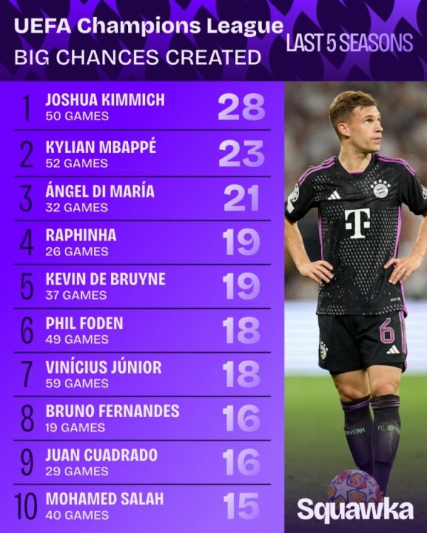 近5年欧冠创造要紧契机榜:基米希28次领跑,B费19场16次后果最高