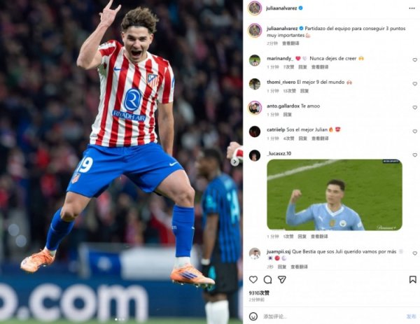 11月27日讯 在本轮欧冠,马竞2-1打败国米。 本场比赛阿尔瓦雷斯破门,赛后他也在个东说念主社媒晒出本场庆祝相片,配文写说念:“球队拿出很棒的证实,获取伏击的三分!”......查看更多